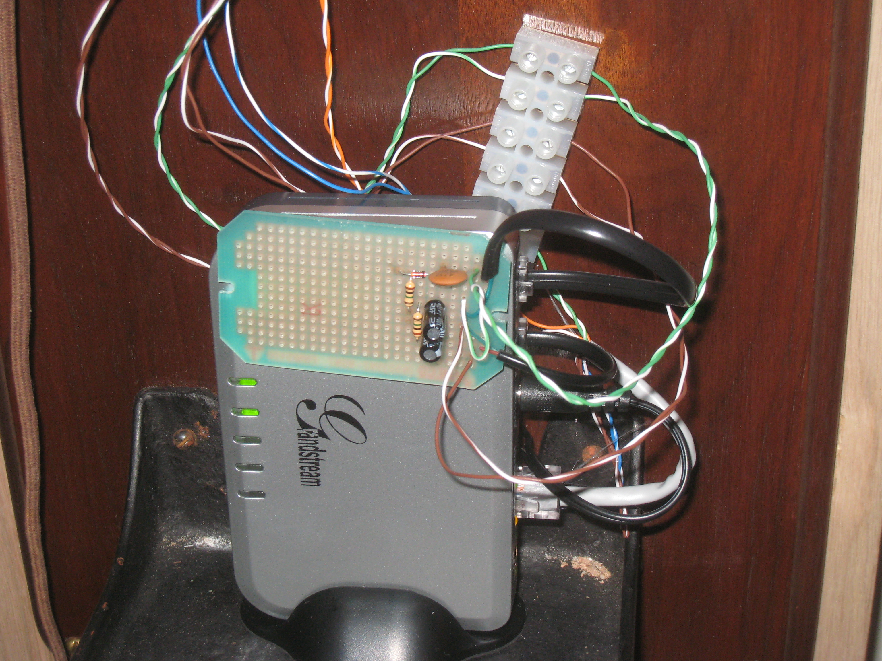 The phone was reassembled, and the alligator-clip-based prototype was turned into a breadboarded circuit placed in the battery box along with the VoIP SIP adapter. All incoming connections (power, ethernet, magneto, triplet) are demarced via a bus-bar. No new holes were drilled but, I confess, the battery-wire holes in the backboard were ever so slightly enlarged to make these cables fit.