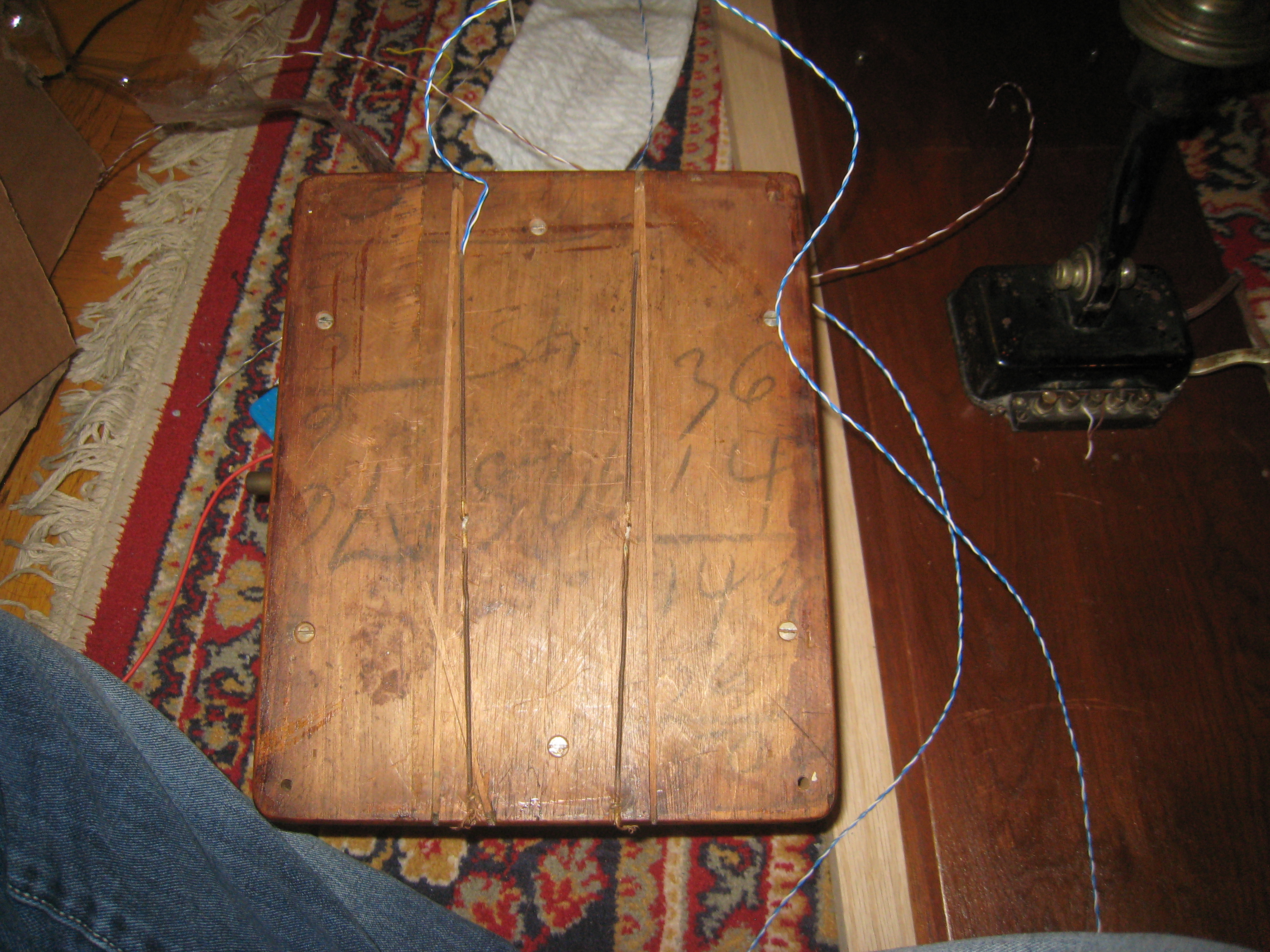 I have subsequently added a mid-1900s-era Western Electric (I know, I know; this particular dial had emotional significance, being from my paternal grandmother’s phone) rotary dial to the system, mounted to the frame below the phone. (Recall the goal of zero modifications to the phone; mounting elsewhere would have been tricky.) To house the dial, my father constructed a wooden frame from two pieces of board atop each other, and applied a circular drill bit matched to the dial. This left enough room behind the dial for a bus-bar demarcation, as inside the battery box, above.