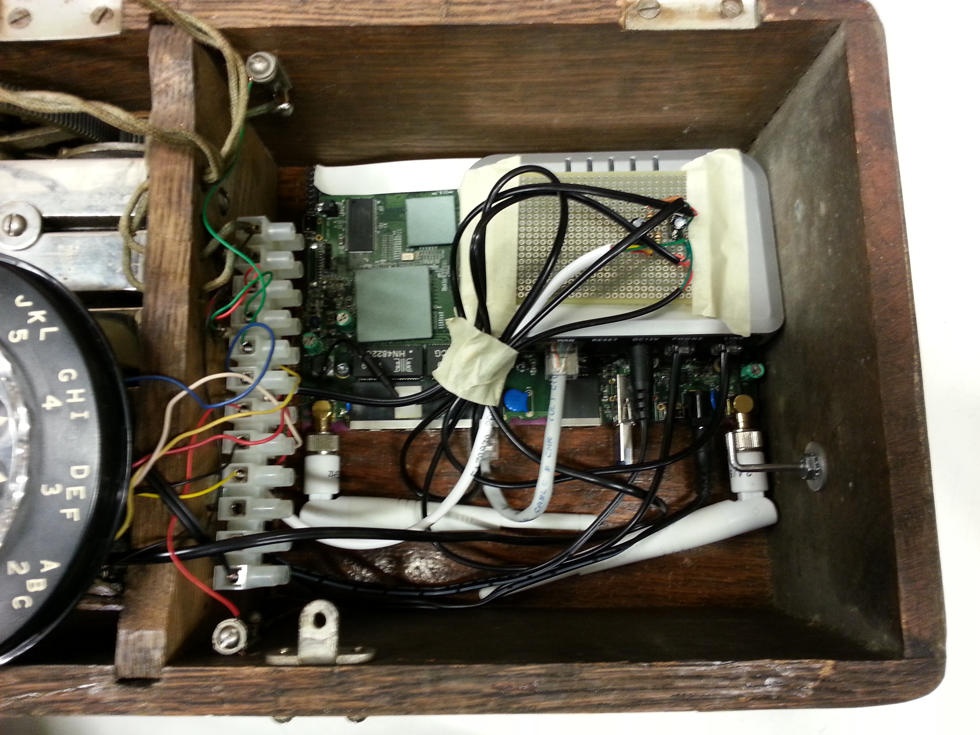 I replicated this project for a friend’s birthday. That setup uses a single-box phone with a built in computer (a DIR-825 wireless router denuded of its plastic; subsequently, that board having failed, it was replaced with a Raspberry Pi and a 12V/5V step-down DC converter) in addition to the SIP adapter and has a dial added directly in to the main box. As per usual, the interface between the electronics and the phone body and dial is done via a demarcation bus bar to keep things modular.